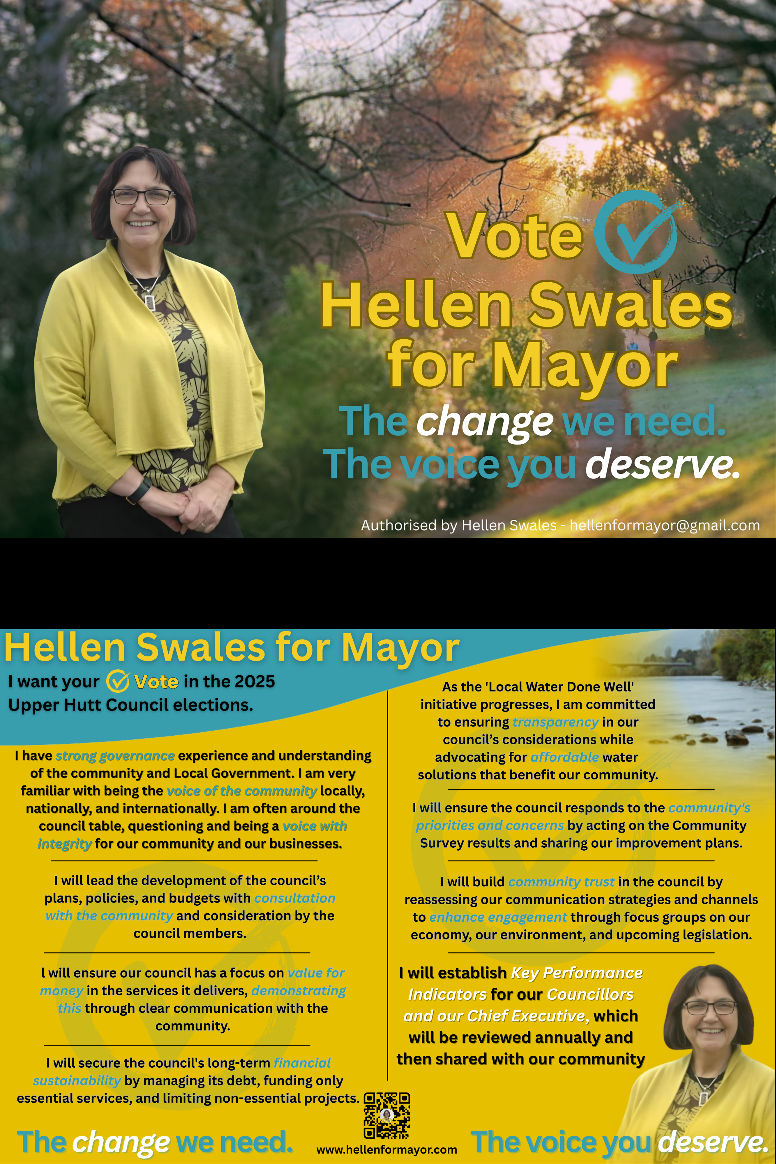 Please also encourage your friends, family, and network to cast their vote for me as Mayor. Becoming the next Mayor of Upper Hutt would be a true privilege.